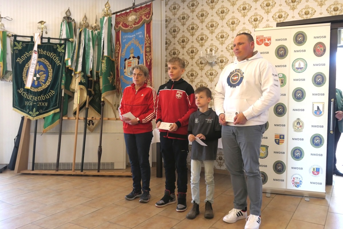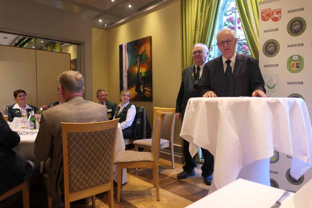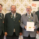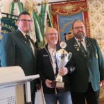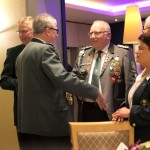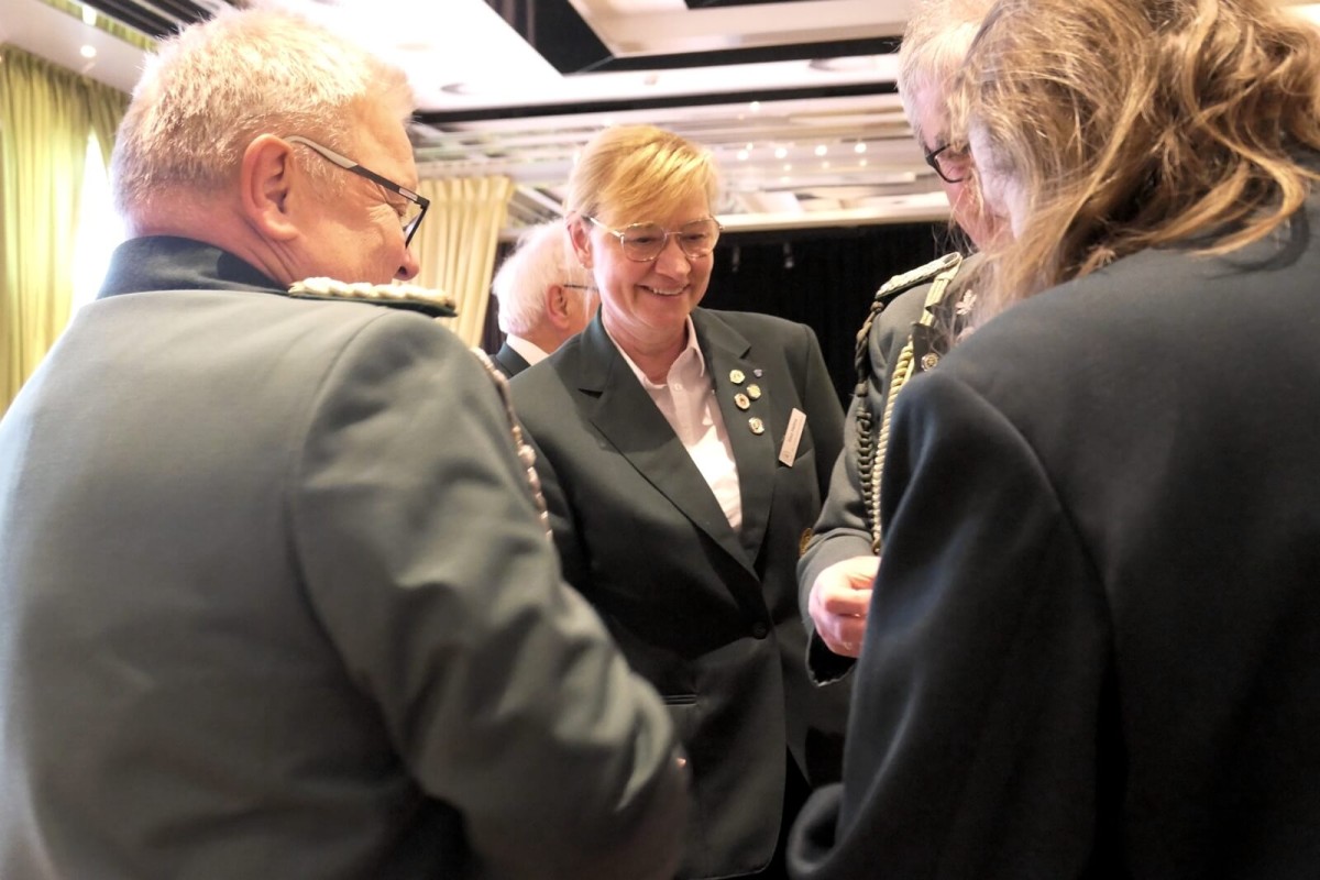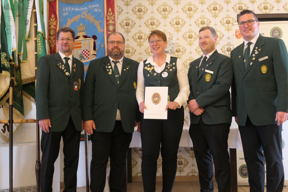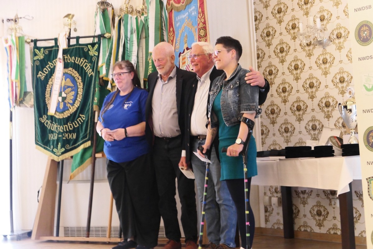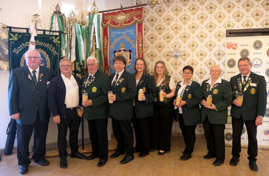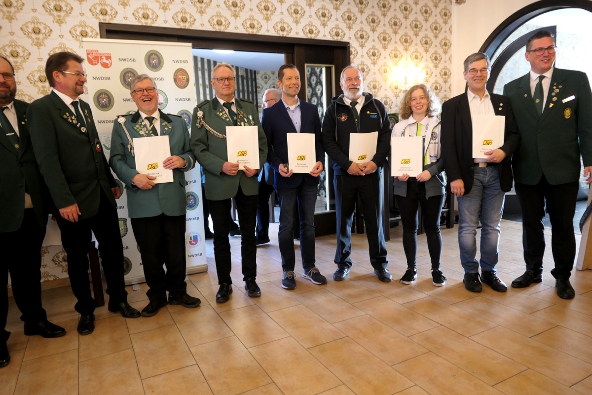 Als letzte wurden die Organisatoren des 72. Landesschützentages auf die "Bühne" gebeten und geehrt. Sie alle erhielten als eine Erinnerung und Dank für ihre Arbeit, einen Trinkbecher mit NWDSB-Emblem versehen vom Geschäftsführer Volker Kächele. Von links: Bezirkspräsident Karl-Friedrich Scharrelmann, Ulrich Ehlers, Friedel Kelkenberg, Thomas Nowak, Britta Löhmann, Lena Löhmann, Bianca Meyer, Marianne Vallan u. Siegfried Brockmann.