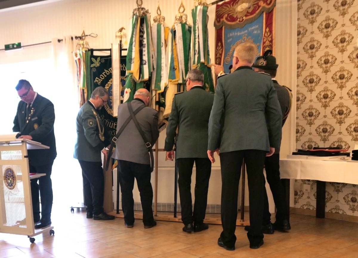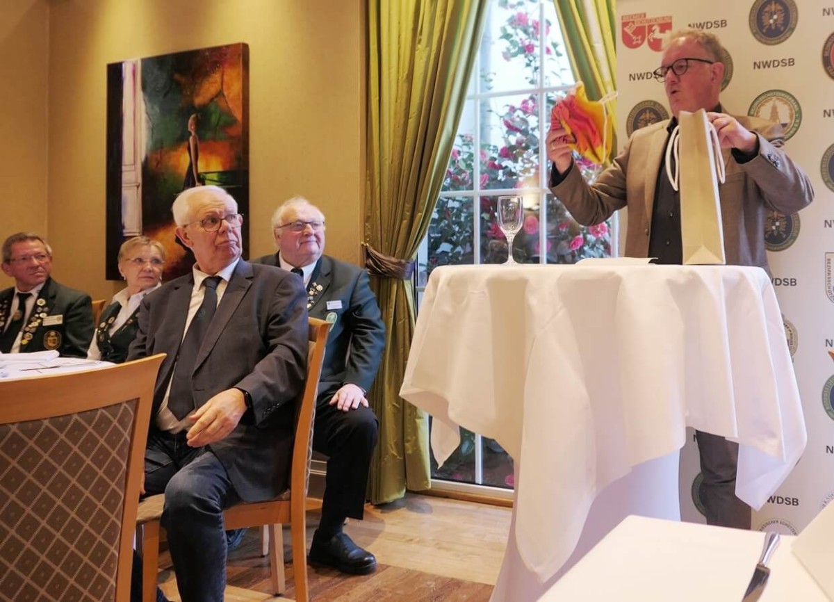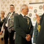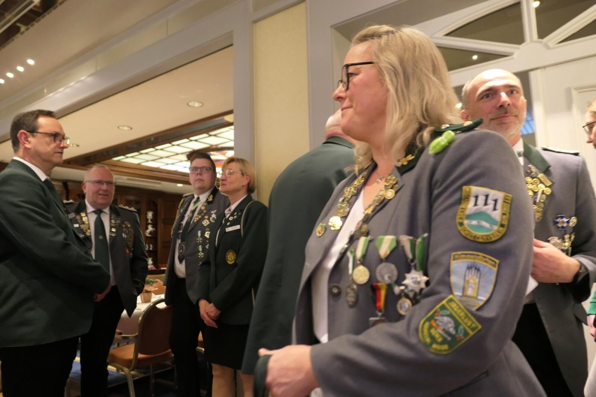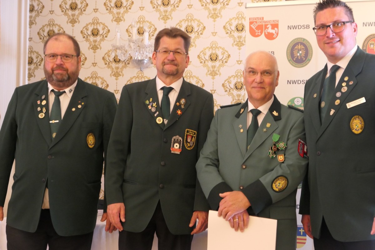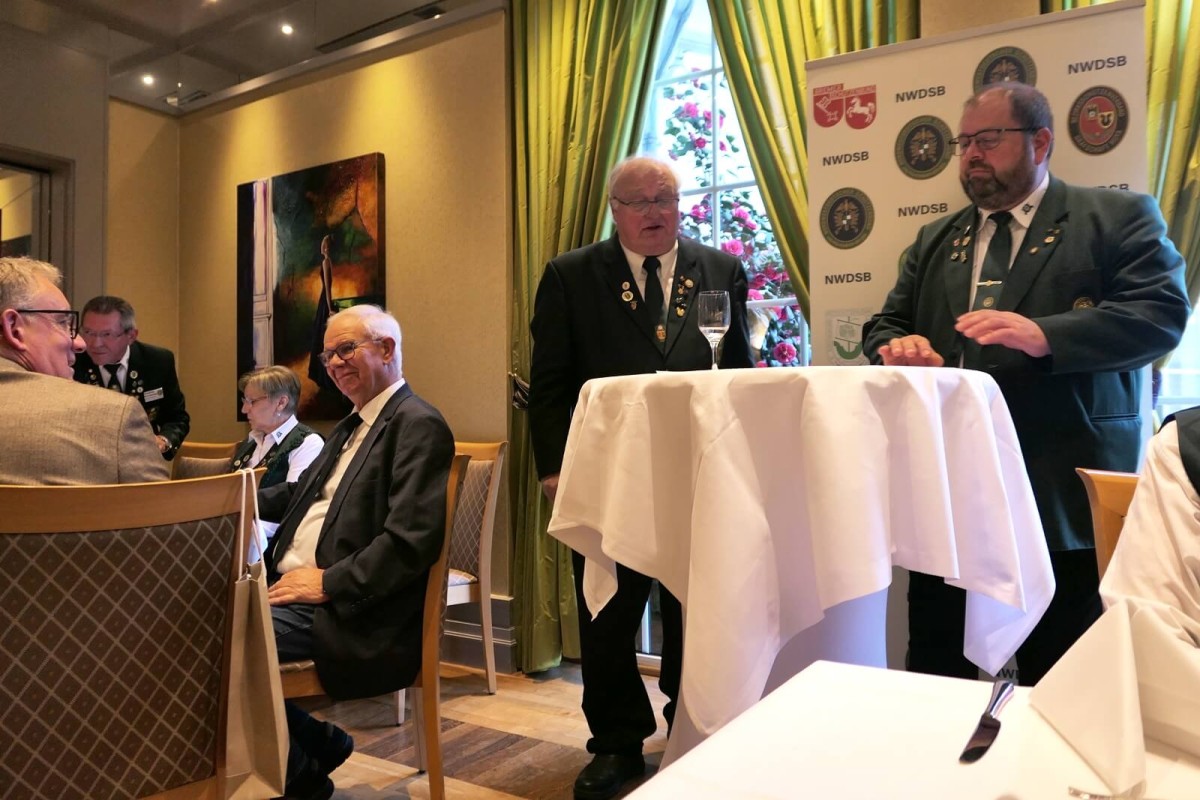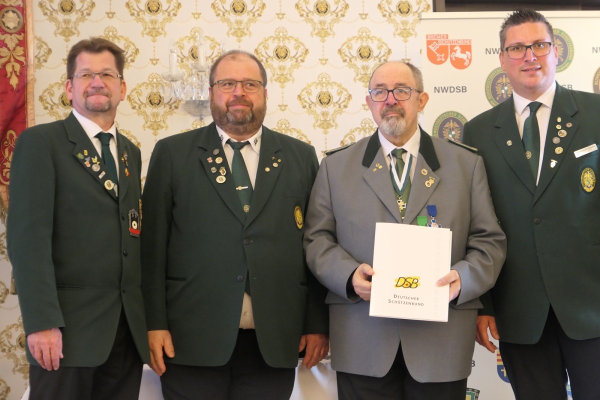 Als letzte wurden die Organisatoren des 72. Landesschützentages auf die "Bühne" gebeten und geehrt. Sie alle erhielten als eine Erinnerung und Dank für ihre Arbeit, einen Trinkbecher mit NWDSB-Emblem versehen vom Geschäftsführer Volker Kächele. Von links: Bezirkspräsident Karl-Friedrich Scharrelmann, Ulrich Ehlers, Friedel Kelkenberg, Thomas Nowak, Britta Löhmann, Lena Löhmann, Bianca Meyer, Marianne Vallan u. Siegfried Brockmann.