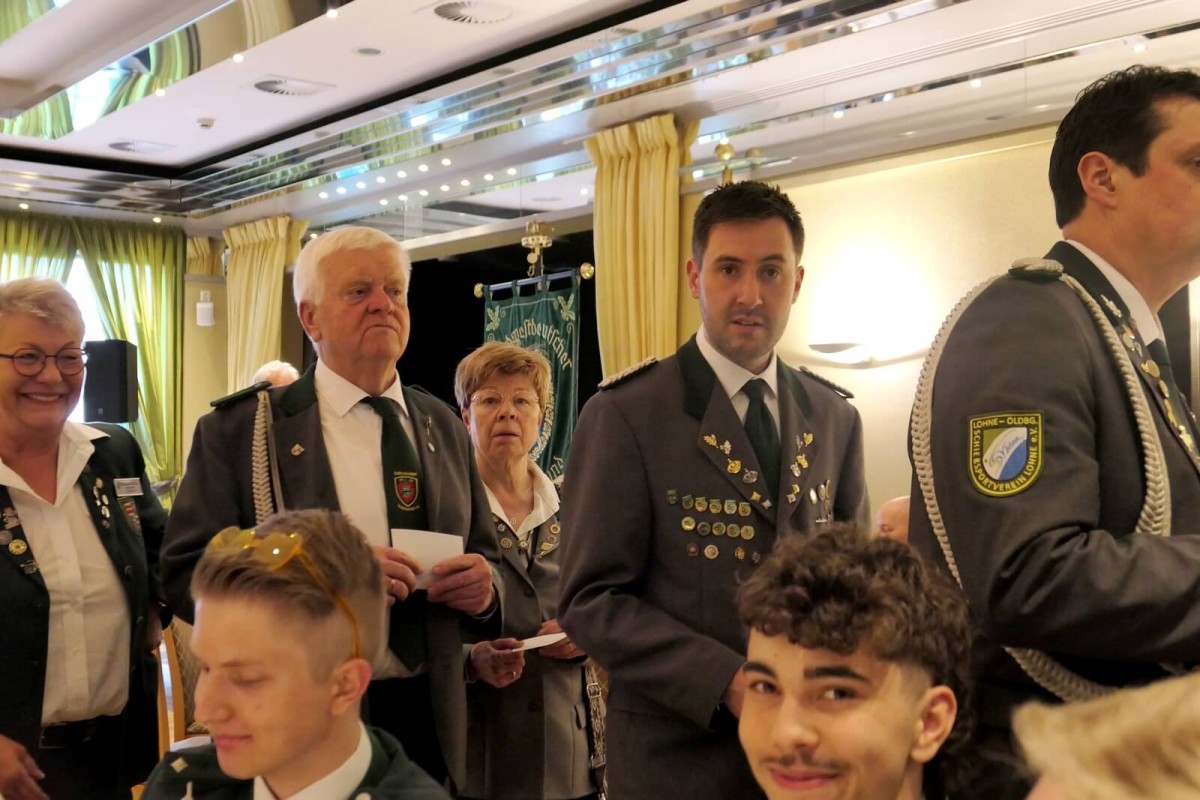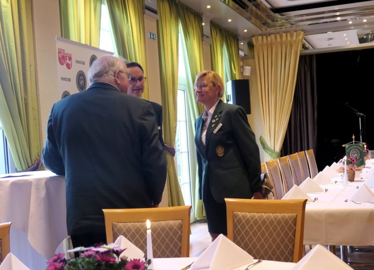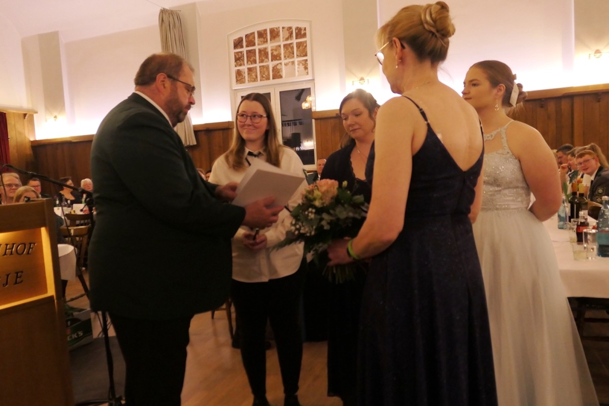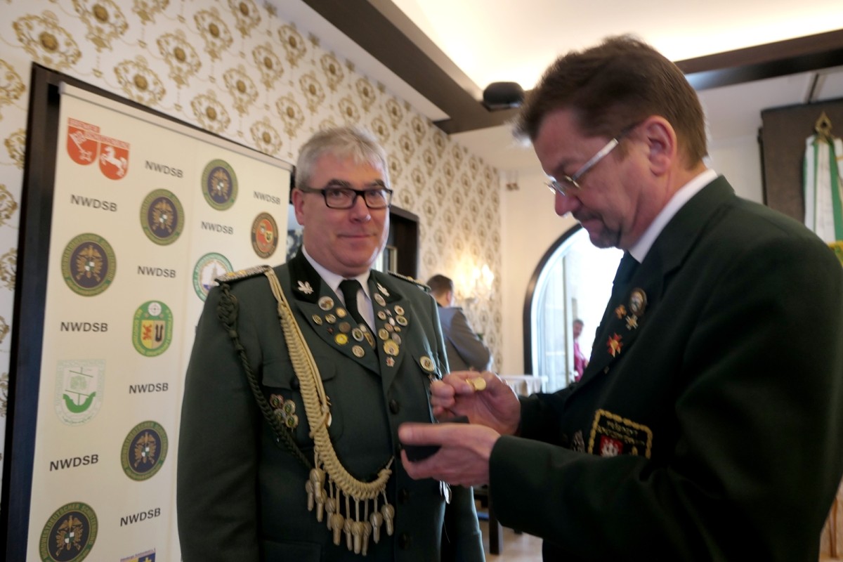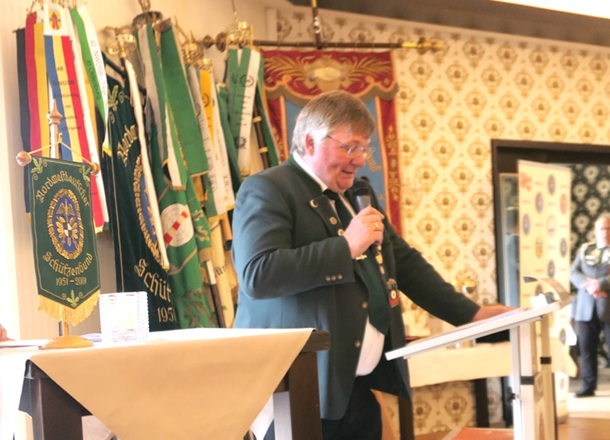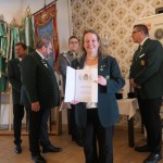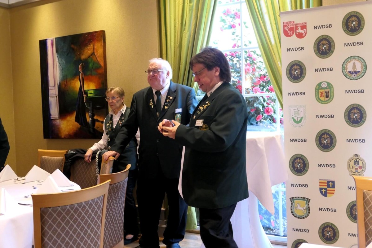Als letzte wurden die Organisatoren des 72. Landesschützentages auf die "Bühne" gebeten und geehrt. Sie alle erhielten als eine Erinnerung und Dank für ihre Arbeit, einen Trinkbecher mit NWDSB-Emblem versehen vom Geschäftsführer Volker Kächele. Von links: Bezirkspräsident Karl-Friedrich Scharrelmann, Ulrich Ehlers, Friedel Kelkenberg, Thomas Nowak, Britta Löhmann, Lena Löhmann, Bianca Meyer, Marianne Vallan u. Siegfried Brockmann.
