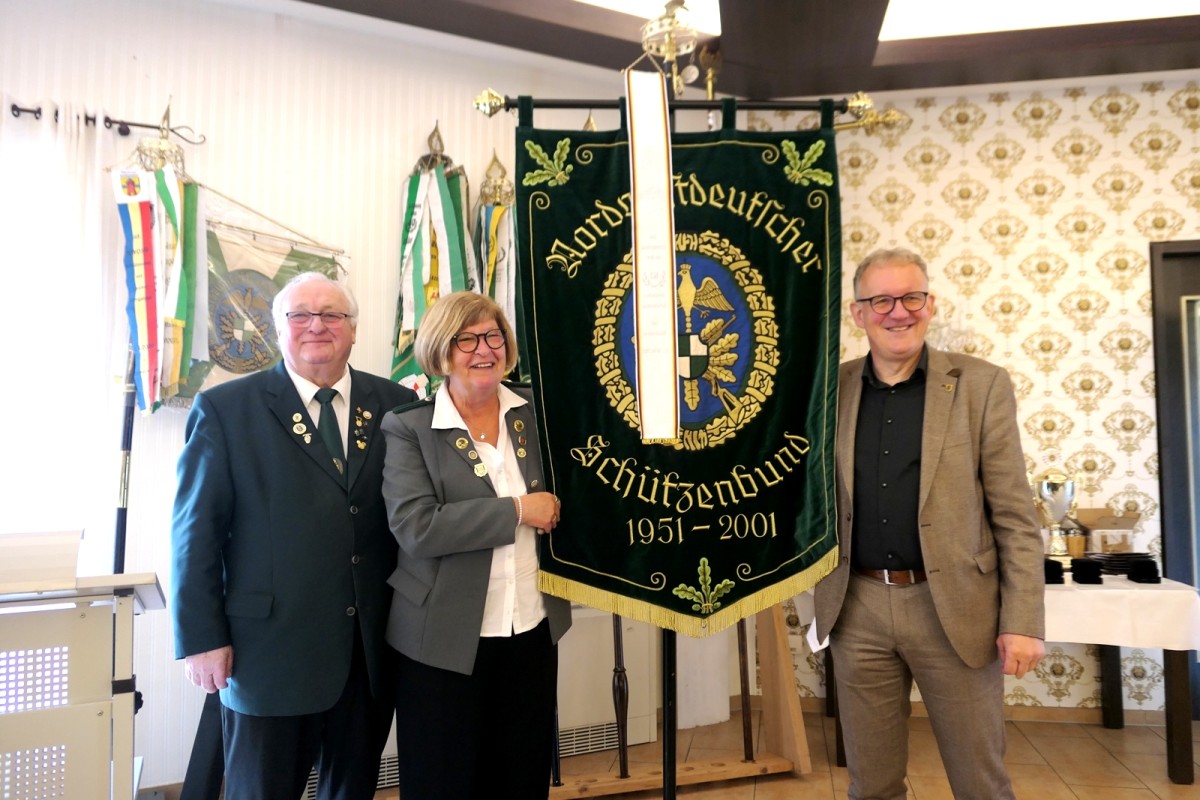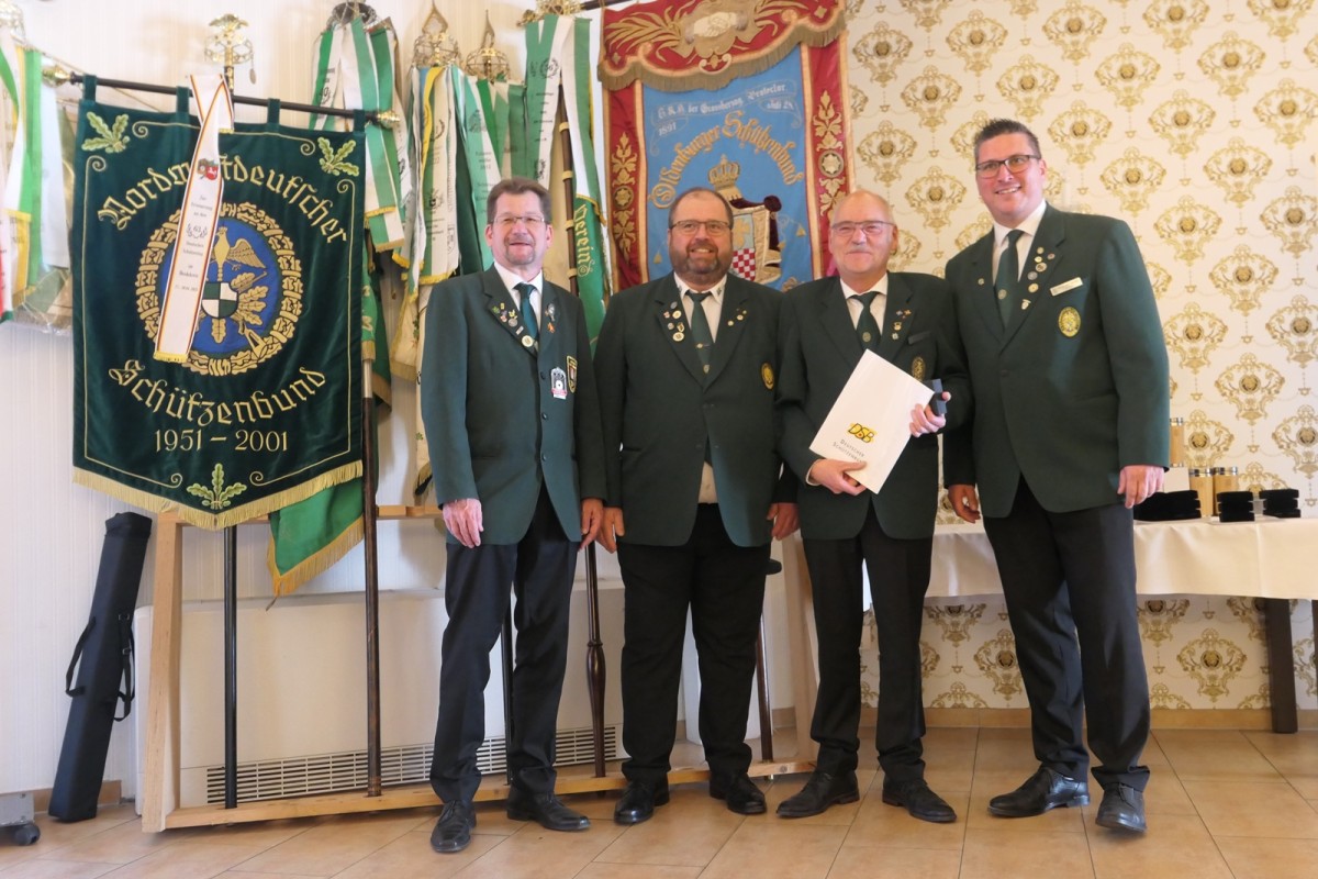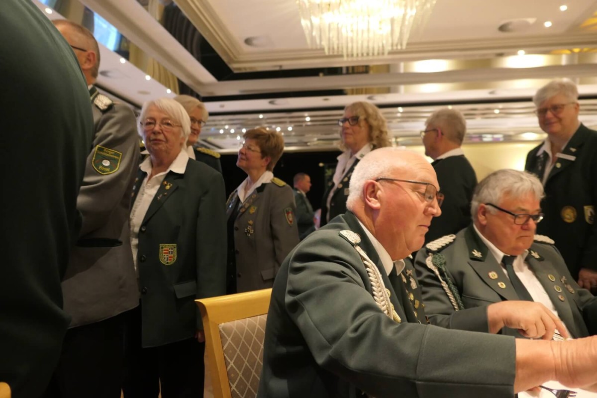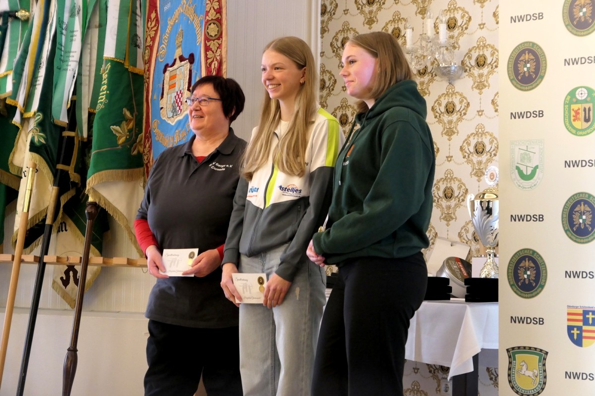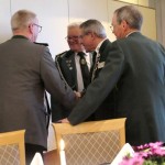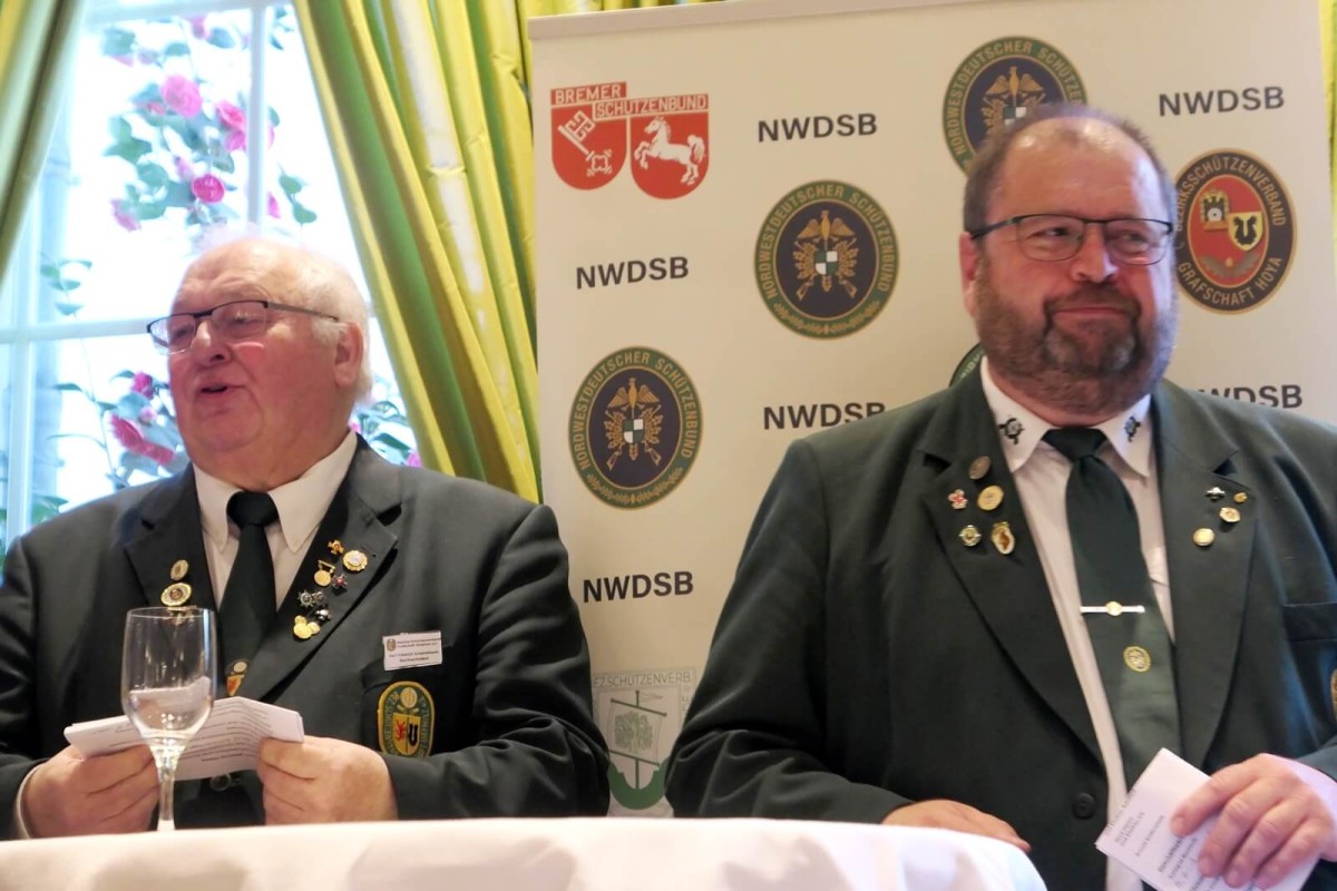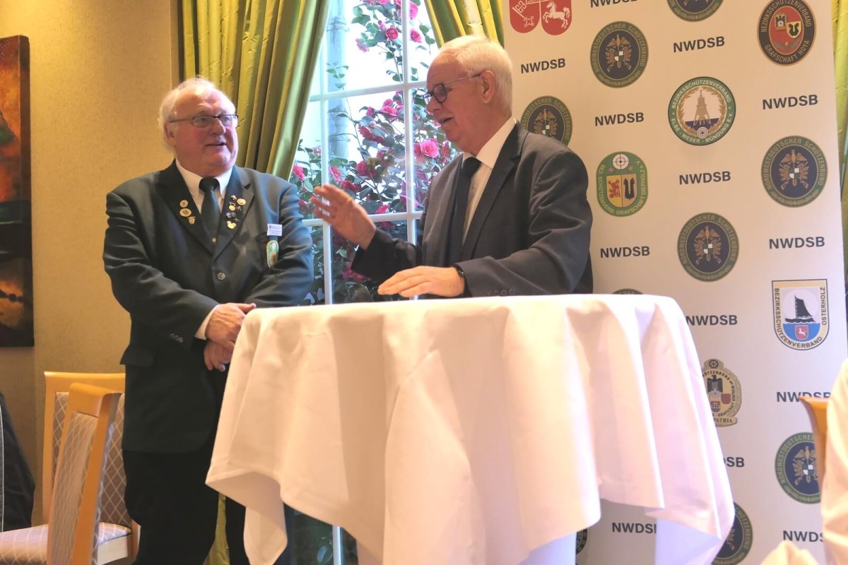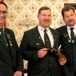 Als letzte wurden die Organisatoren des 72. Landesschützentages auf die "Bühne" gebeten und geehrt. Sie alle erhielten als eine Erinnerung und Dank für ihre Arbeit, einen Trinkbecher mit NWDSB-Emblem versehen vom Geschäftsführer Volker Kächele. Von links: Bezirkspräsident Karl-Friedrich Scharrelmann, Ulrich Ehlers, Friedel Kelkenberg, Thomas Nowak, Britta Löhmann, Lena Löhmann, Bianca Meyer, Marianne Vallan u. Siegfried Brockmann.