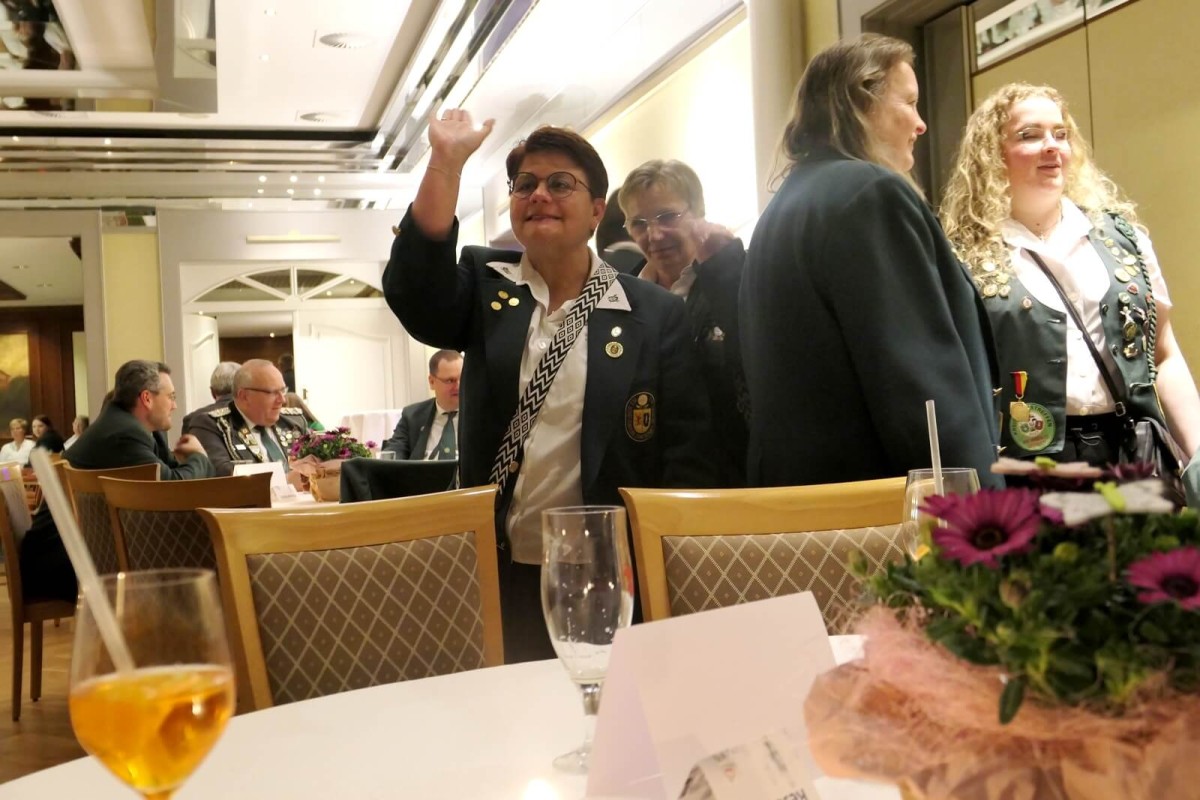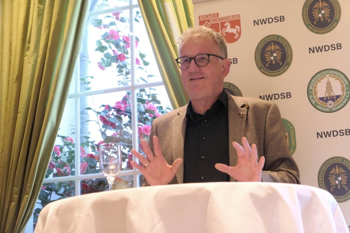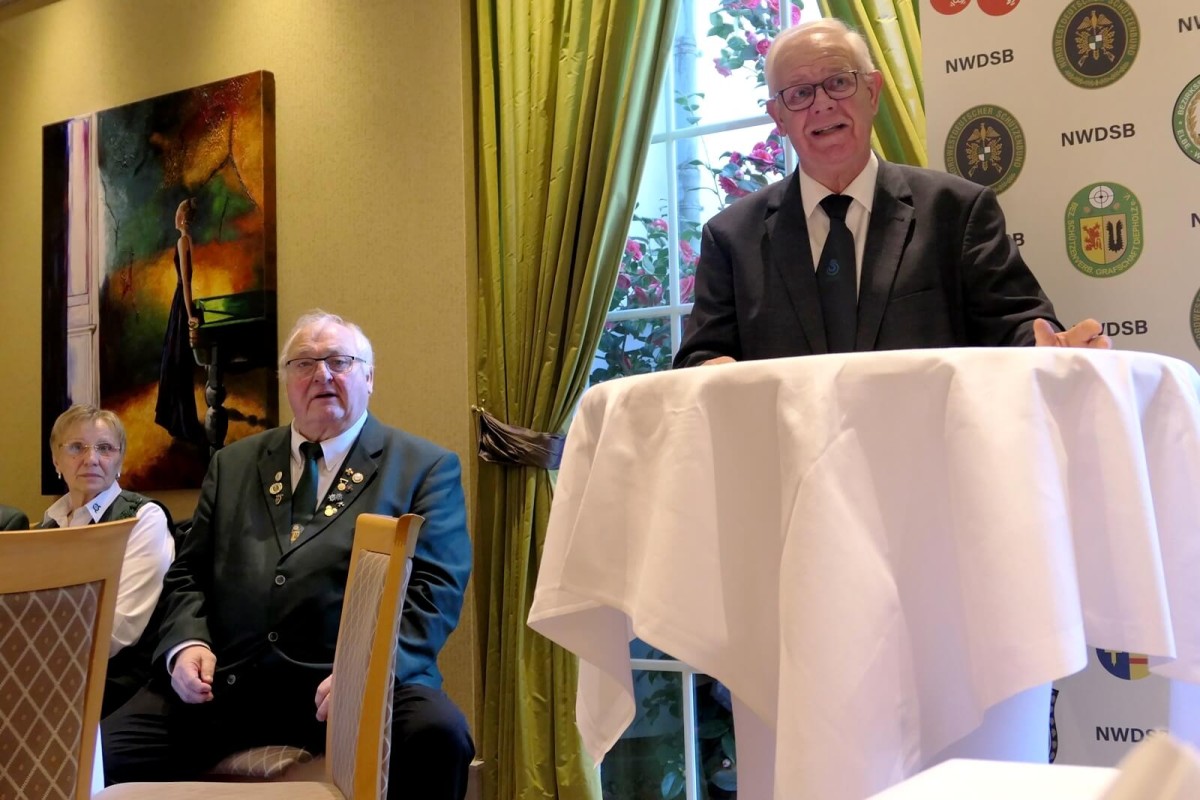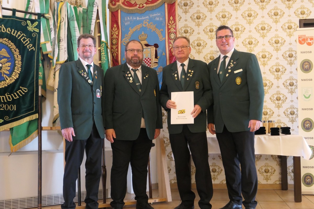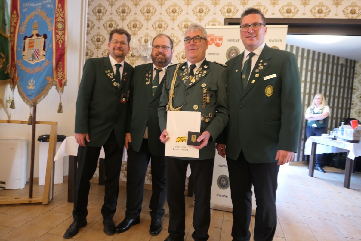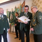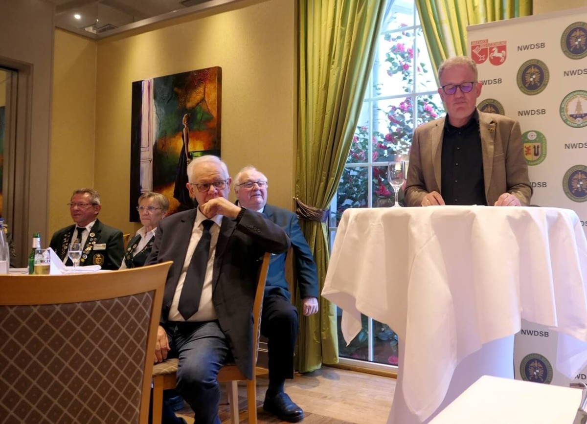 Als letzte wurden die Organisatoren des 72. Landesschützentages auf die "Bühne" gebeten und geehrt. Sie alle erhielten als eine Erinnerung und Dank für ihre Arbeit, einen Trinkbecher mit NWDSB-Emblem versehen vom Geschäftsführer Volker Kächele. Von links: Bezirkspräsident Karl-Friedrich Scharrelmann, Ulrich Ehlers, Friedel Kelkenberg, Thomas Nowak, Britta Löhmann, Lena Löhmann, Bianca Meyer, Marianne Vallan u. Siegfried Brockmann.