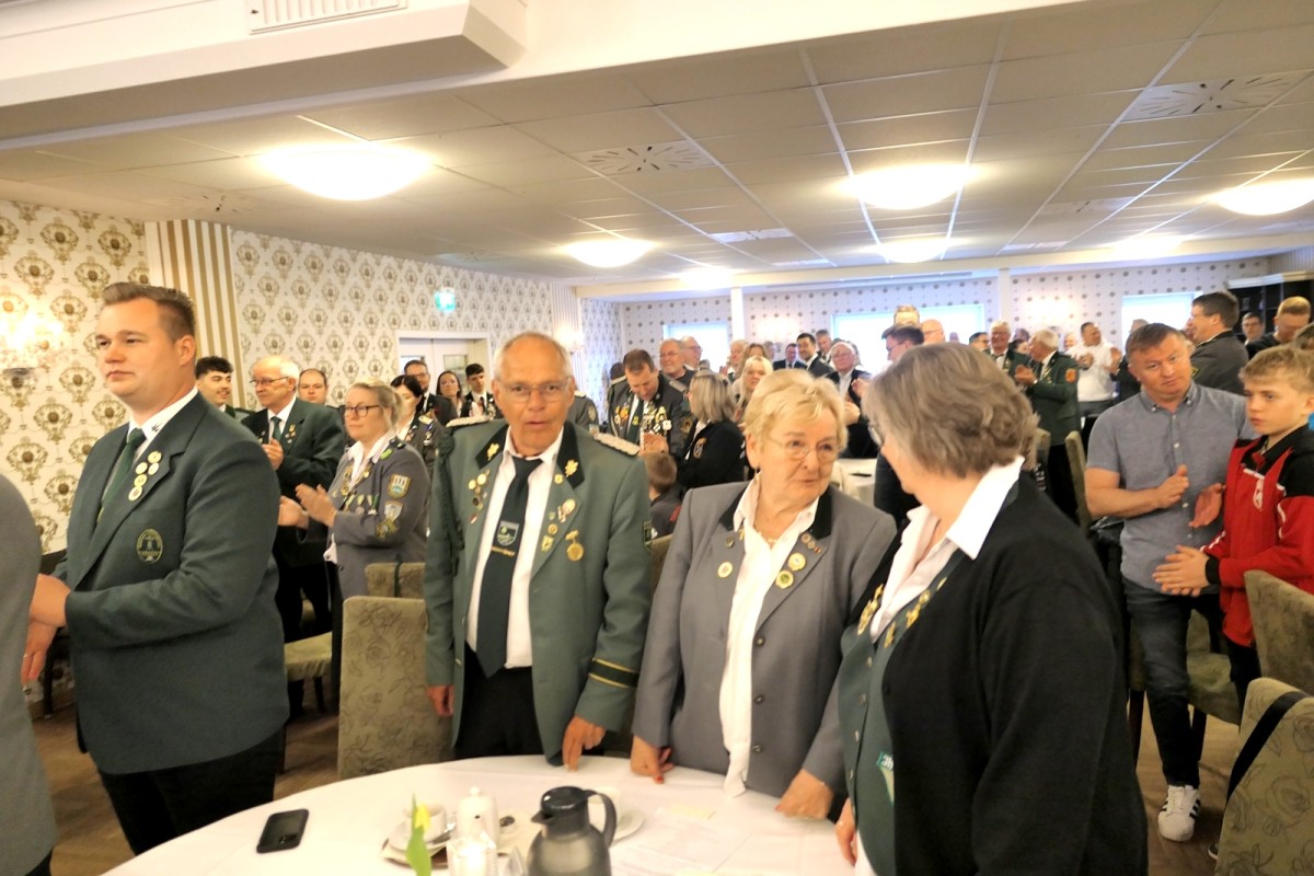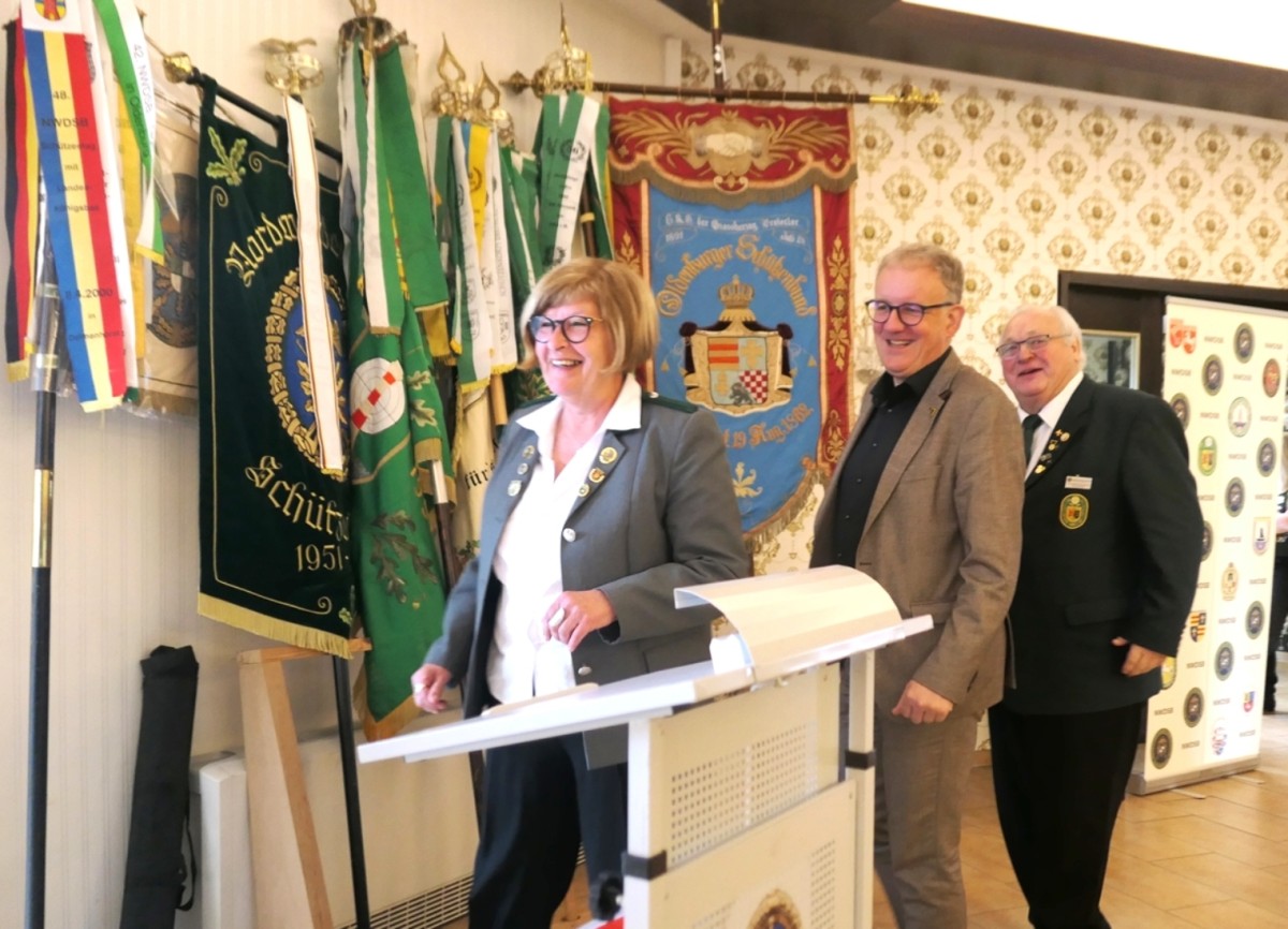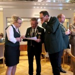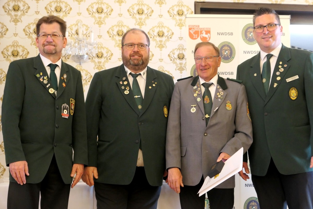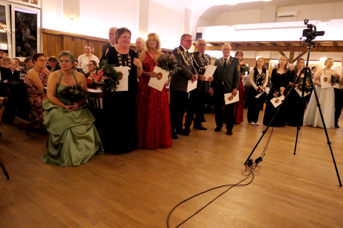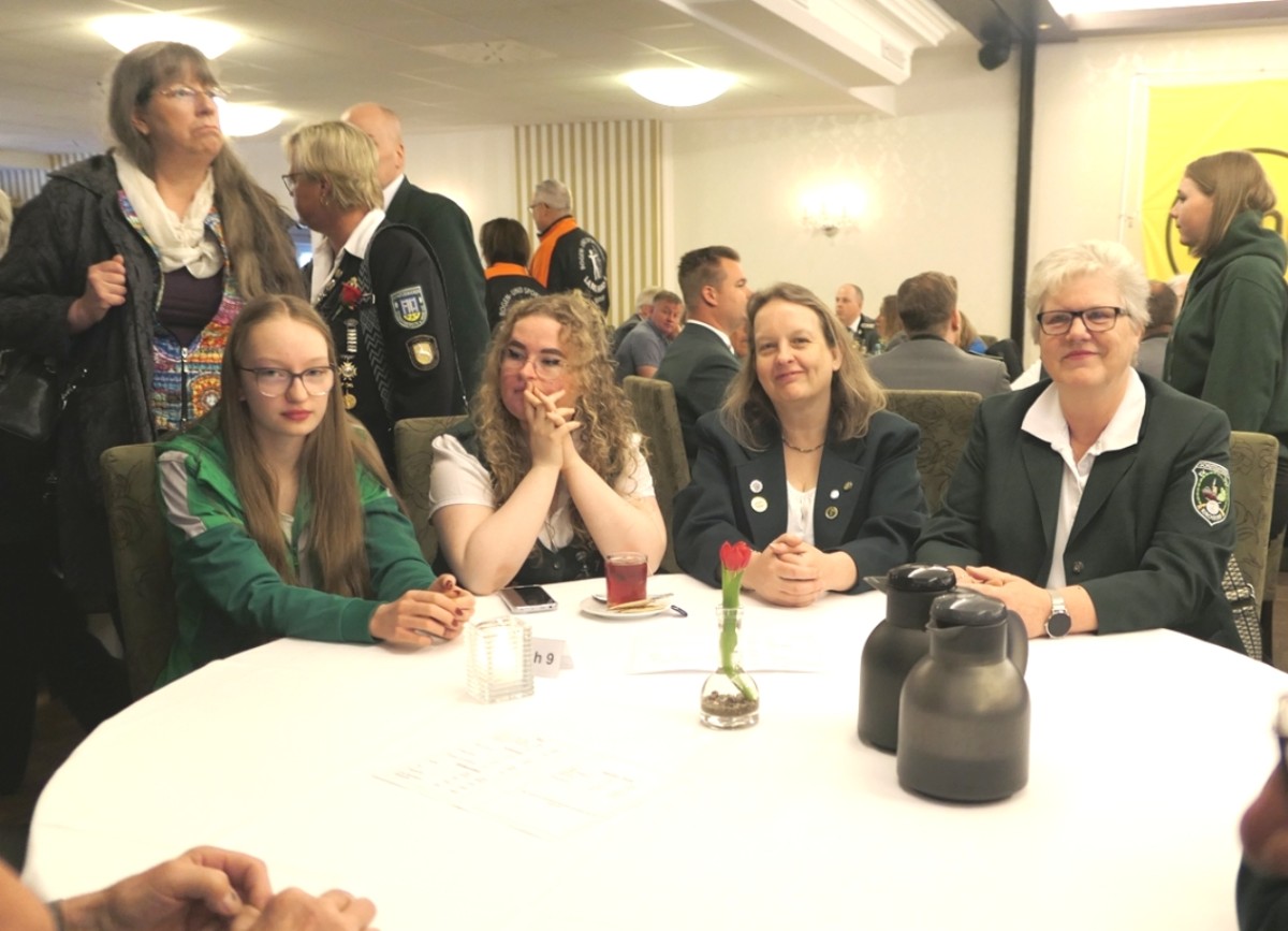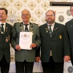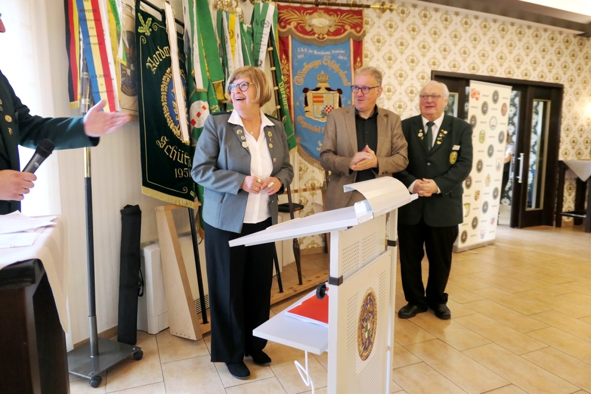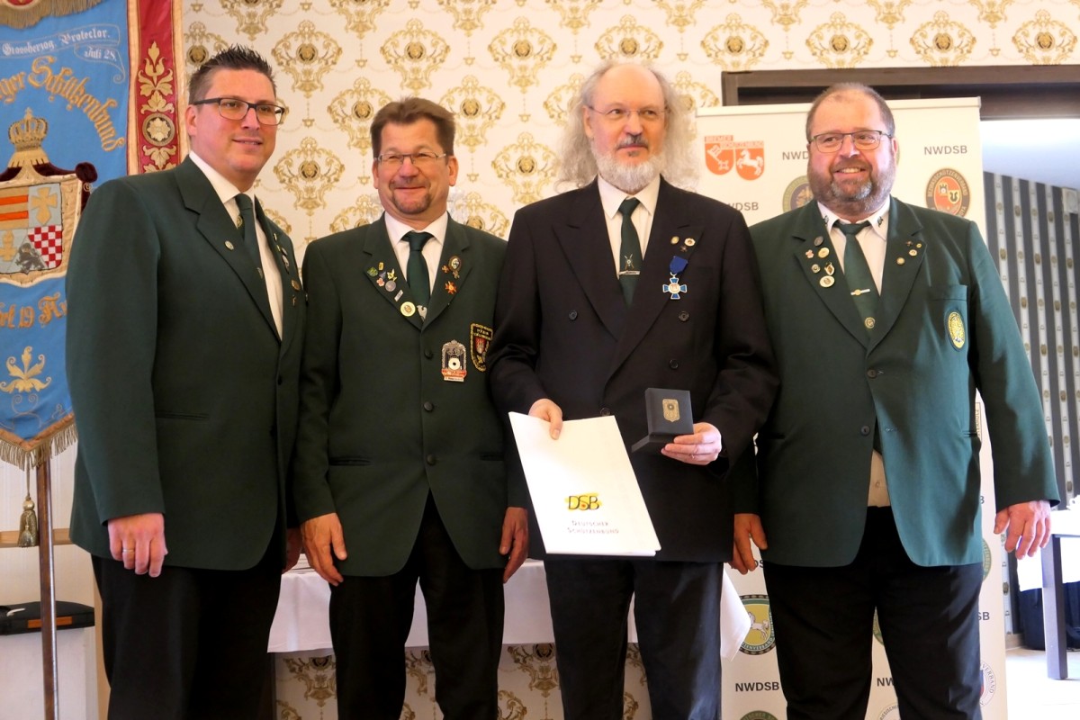 Als letzte wurden die Organisatoren des 72. Landesschützentages auf die "Bühne" gebeten und geehrt. Sie alle erhielten als eine Erinnerung und Dank für ihre Arbeit, einen Trinkbecher mit NWDSB-Emblem versehen vom Geschäftsführer Volker Kächele. Von links: Bezirkspräsident Karl-Friedrich Scharrelmann, Ulrich Ehlers, Friedel Kelkenberg, Thomas Nowak, Britta Löhmann, Lena Löhmann, Bianca Meyer, Marianne Vallan u. Siegfried Brockmann.