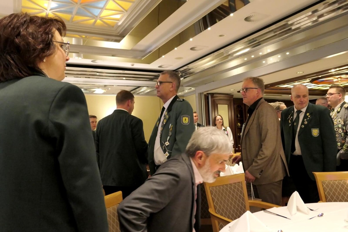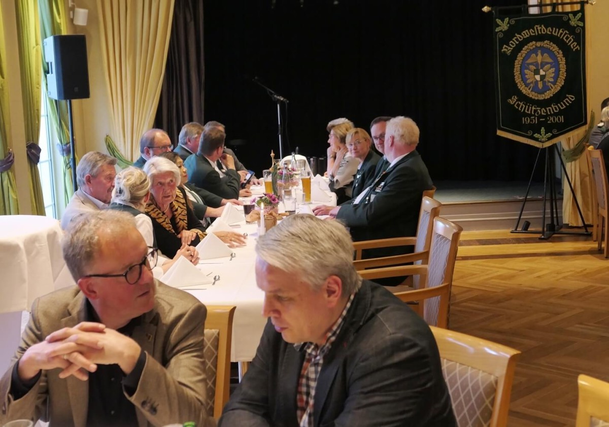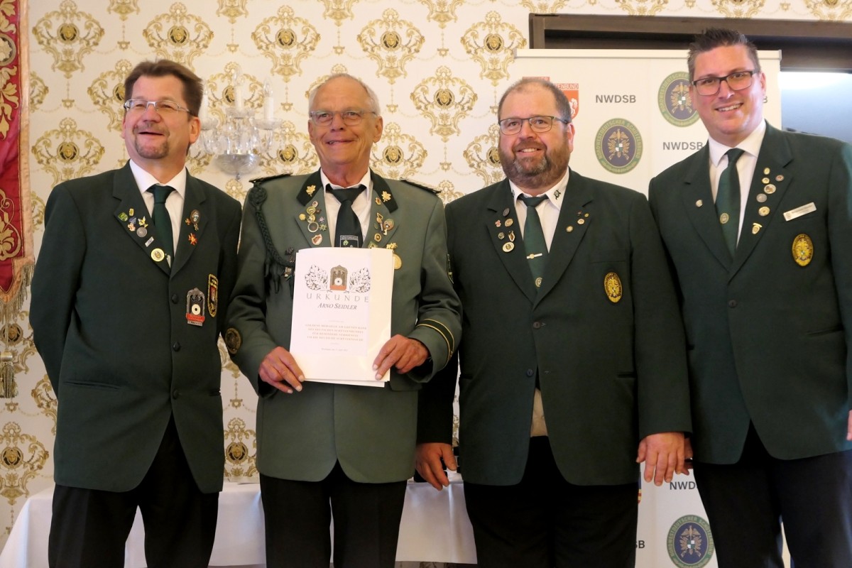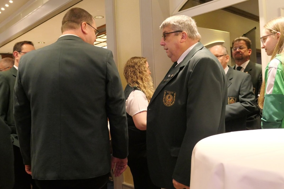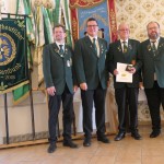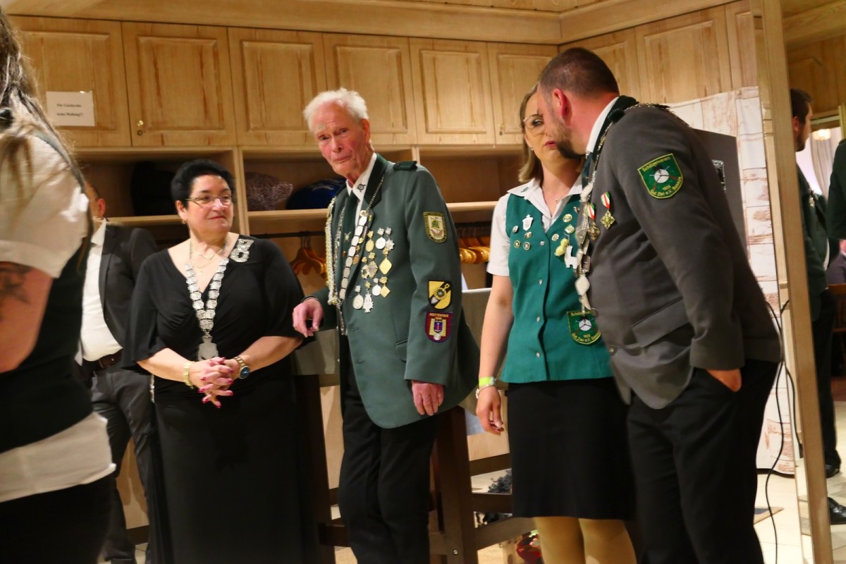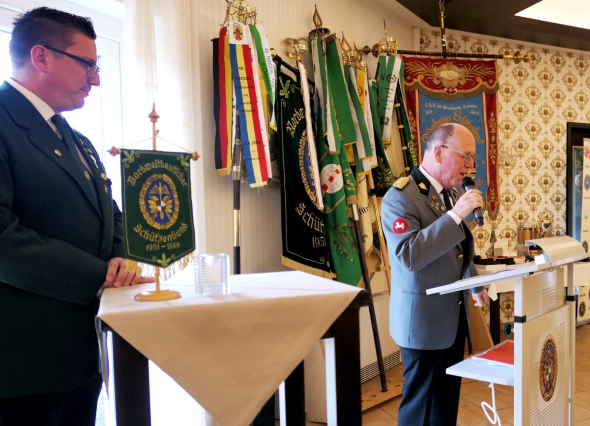 Als letzte wurden die Organisatoren des 72. Landesschützentages auf die "Bühne" gebeten und geehrt. Sie alle erhielten als eine Erinnerung und Dank für ihre Arbeit, einen Trinkbecher mit NWDSB-Emblem versehen vom Geschäftsführer Volker Kächele. Von links: Bezirkspräsident Karl-Friedrich Scharrelmann, Ulrich Ehlers, Friedel Kelkenberg, Thomas Nowak, Britta Löhmann, Lena Löhmann, Bianca Meyer, Marianne Vallan u. Siegfried Brockmann.