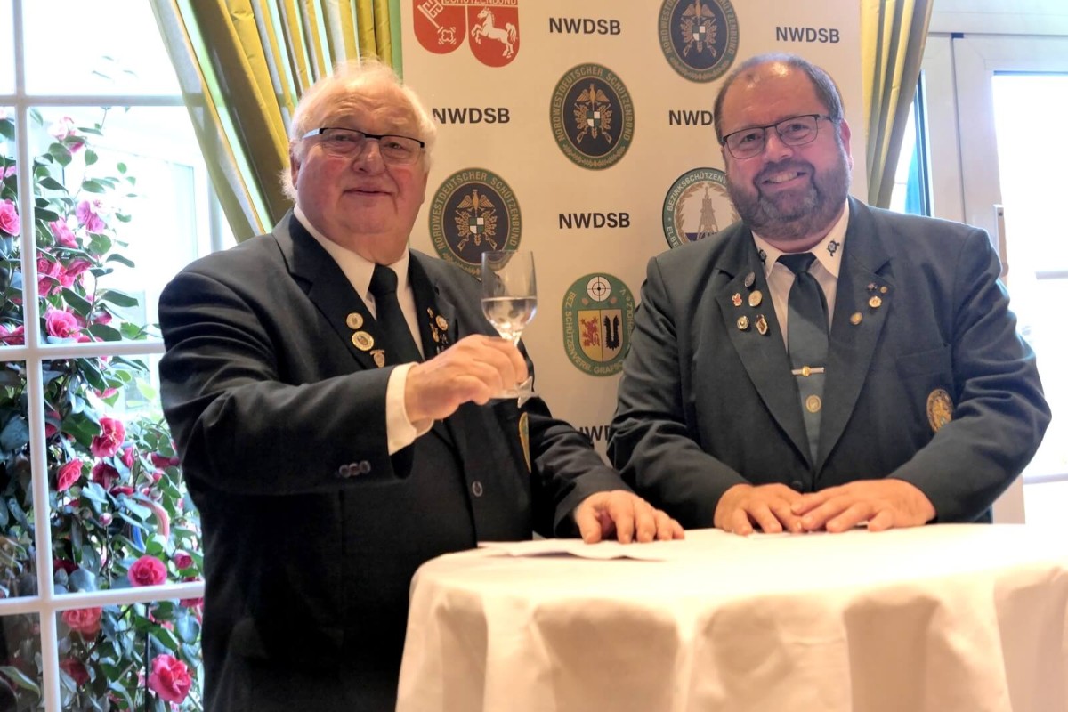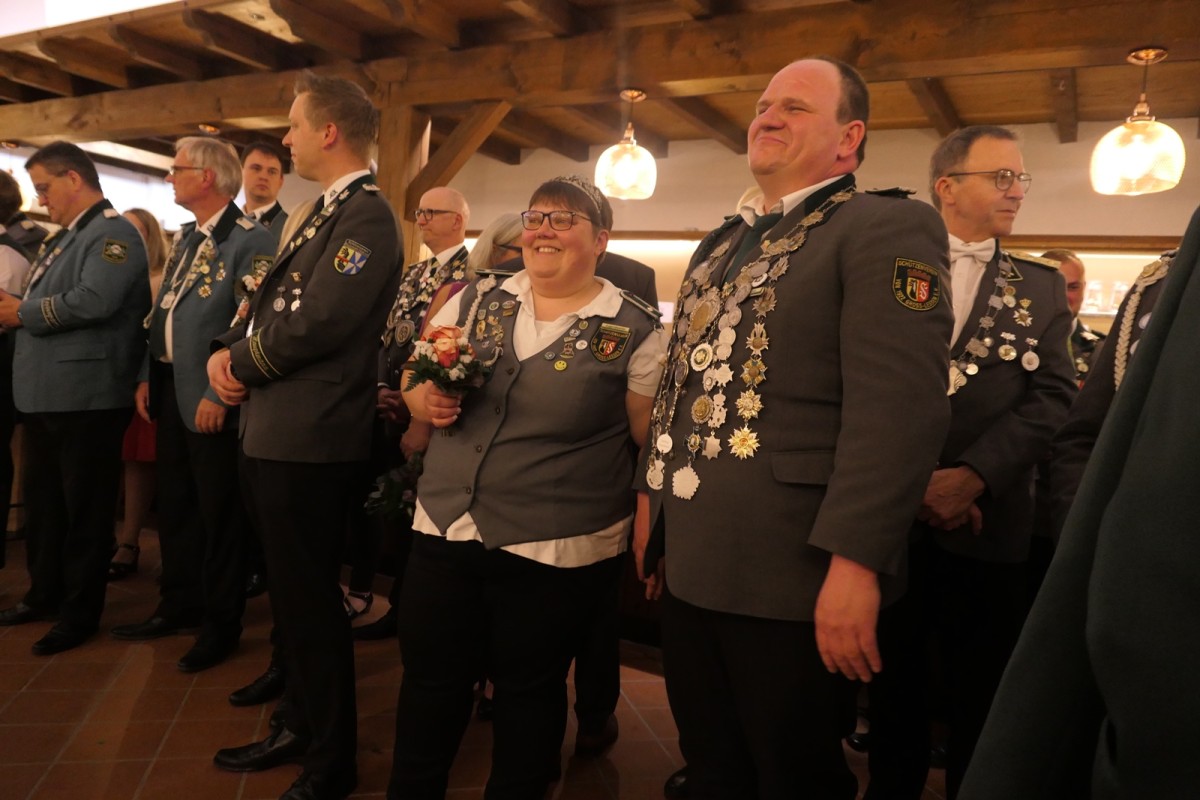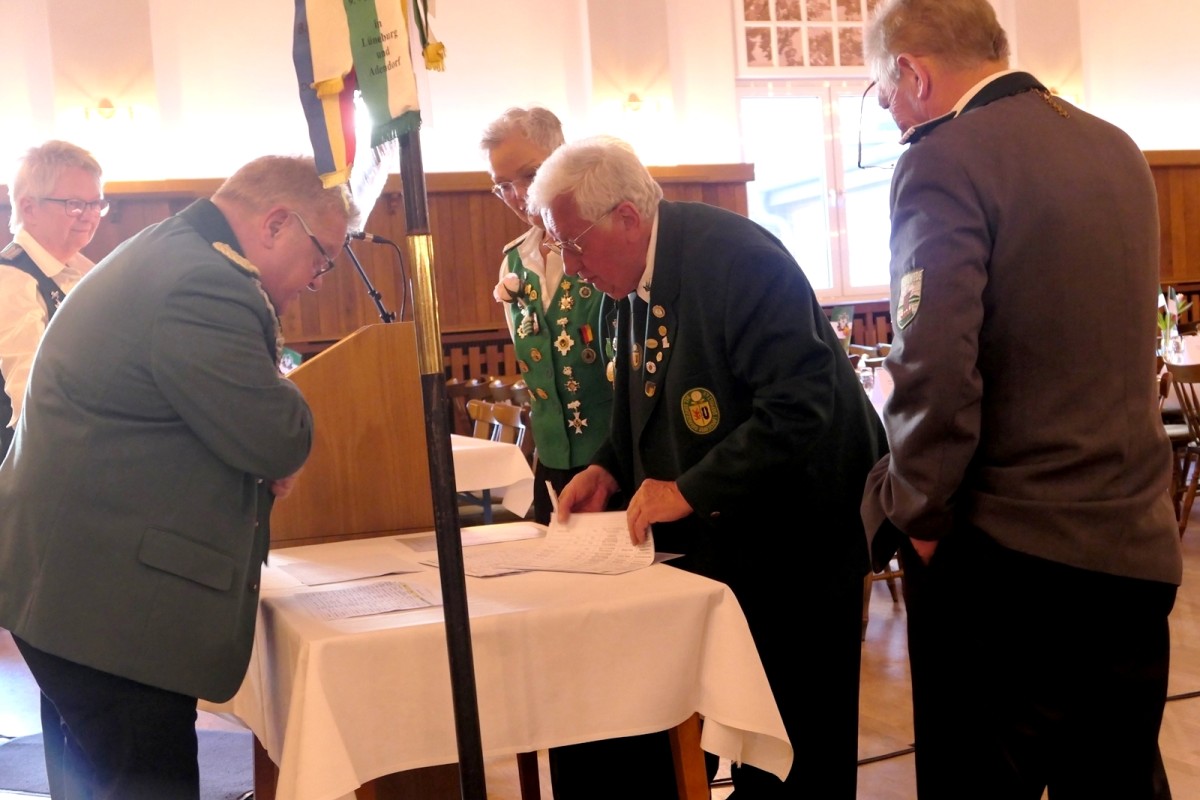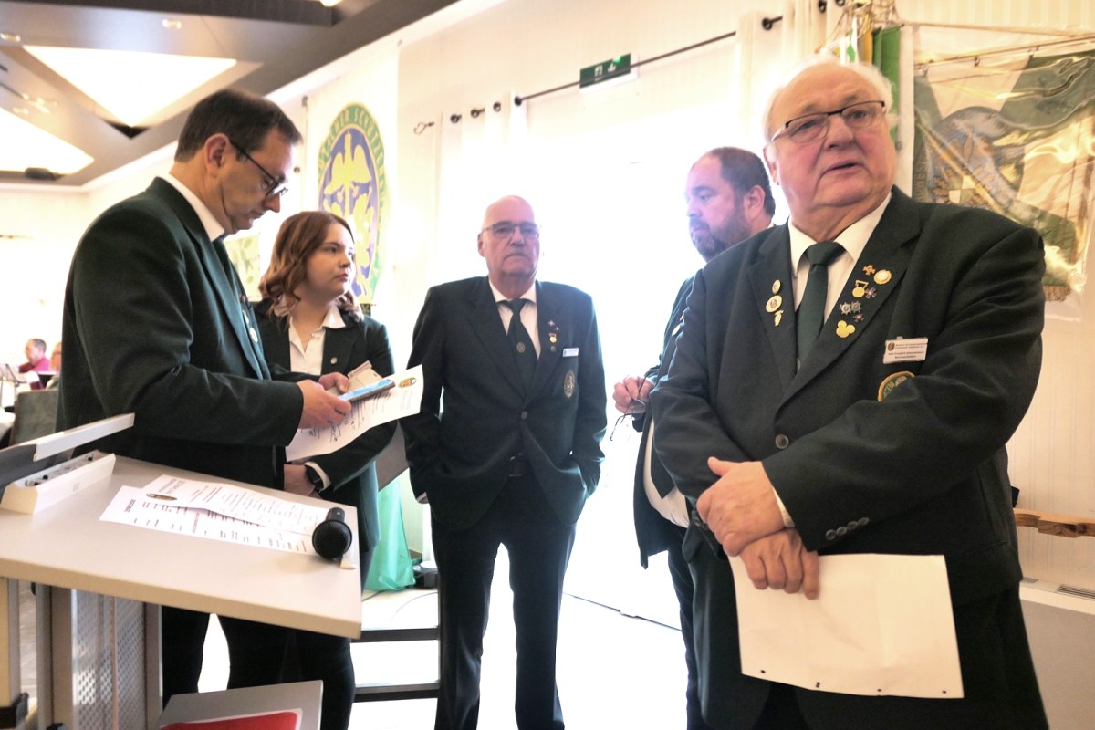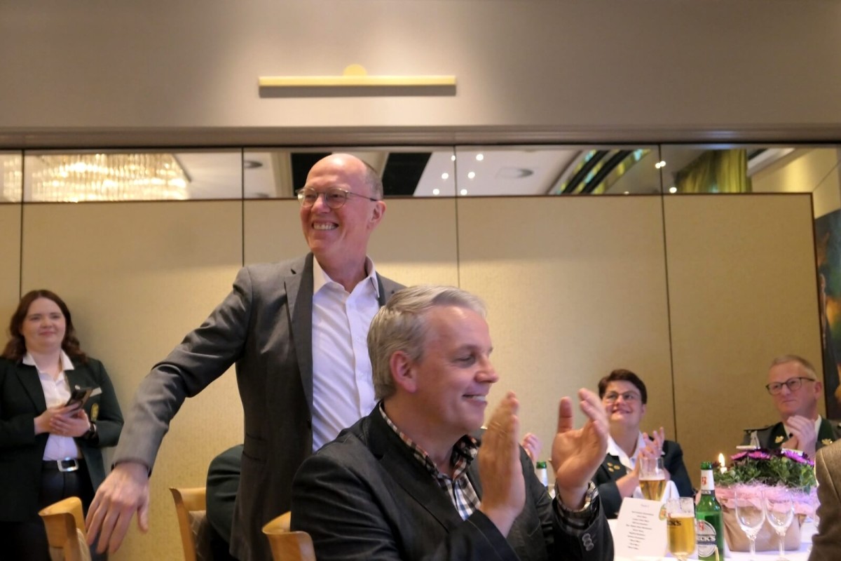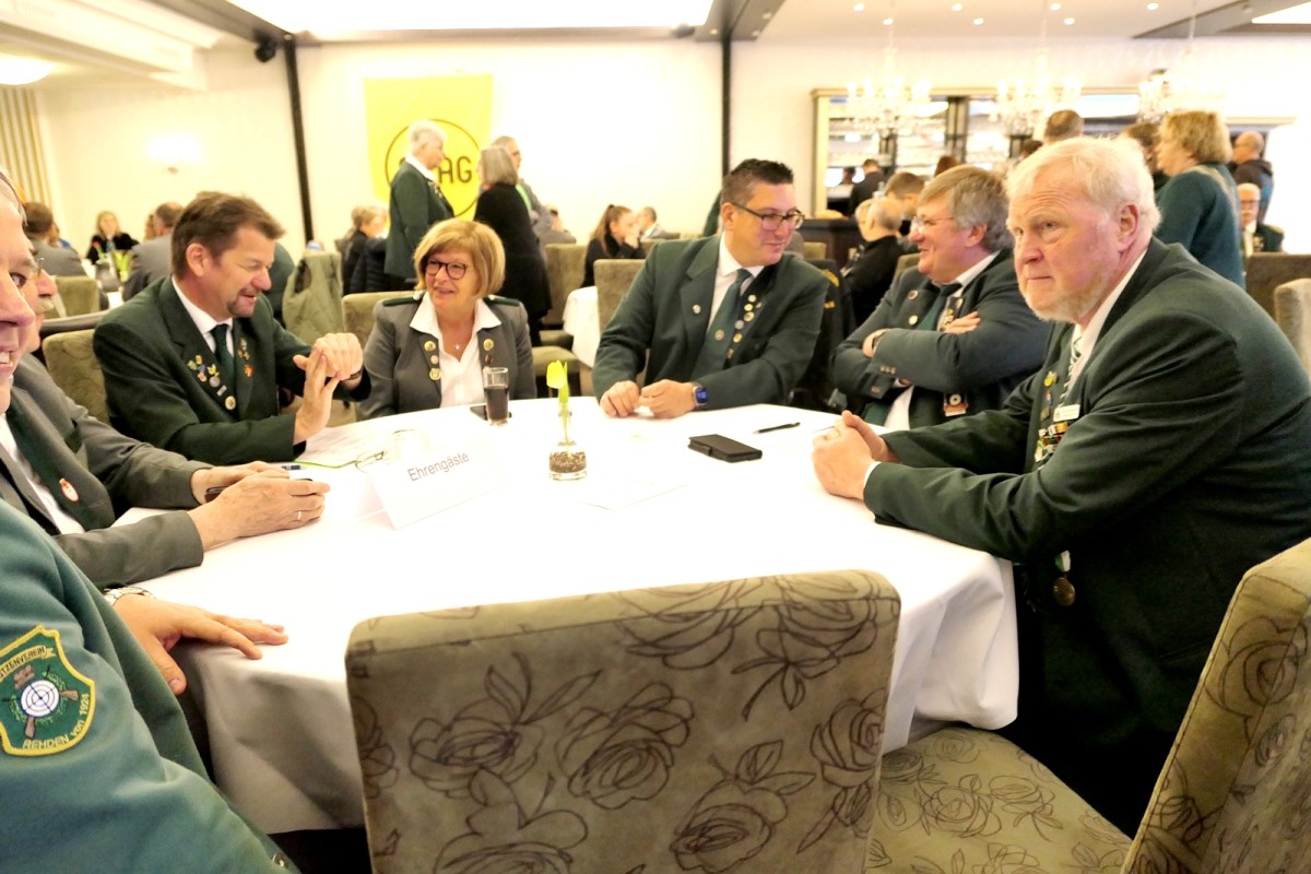 Als letzte wurden die Organisatoren des 72. Landesschützentages auf die "Bühne" gebeten und geehrt. Sie alle erhielten als eine Erinnerung und Dank für ihre Arbeit, einen Trinkbecher mit NWDSB-Emblem versehen vom Geschäftsführer Volker Kächele. Von links: Bezirkspräsident Karl-Friedrich Scharrelmann, Ulrich Ehlers, Friedel Kelkenberg, Thomas Nowak, Britta Löhmann, Lena Löhmann, Bianca Meyer, Marianne Vallan u. Siegfried Brockmann.